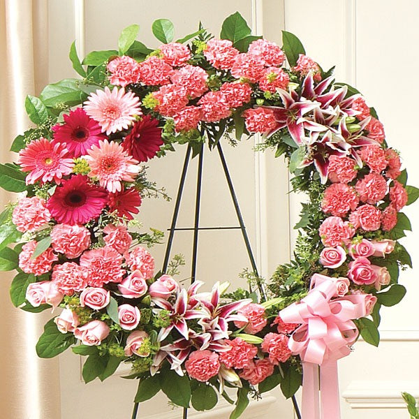 Send your love and condolences with our Bloom in Pink Standing Wreath. Our expert florists in Dallas, Texas use only the freshest flowers to create the perfect funeral or sympathy arrangement. Trust us, the best florist in town, to deliver a meaningful and beautiful tribute to your loved one.