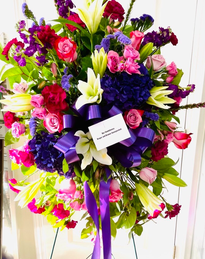 "Let us help you express your sentiments with our Loving Thoughts Standing Spray. Our elegant, designer arrangement is carefully crafted and delivered by the top florist in Dallas, Texas for funeral services. A beautiful gesture during a difficult time."