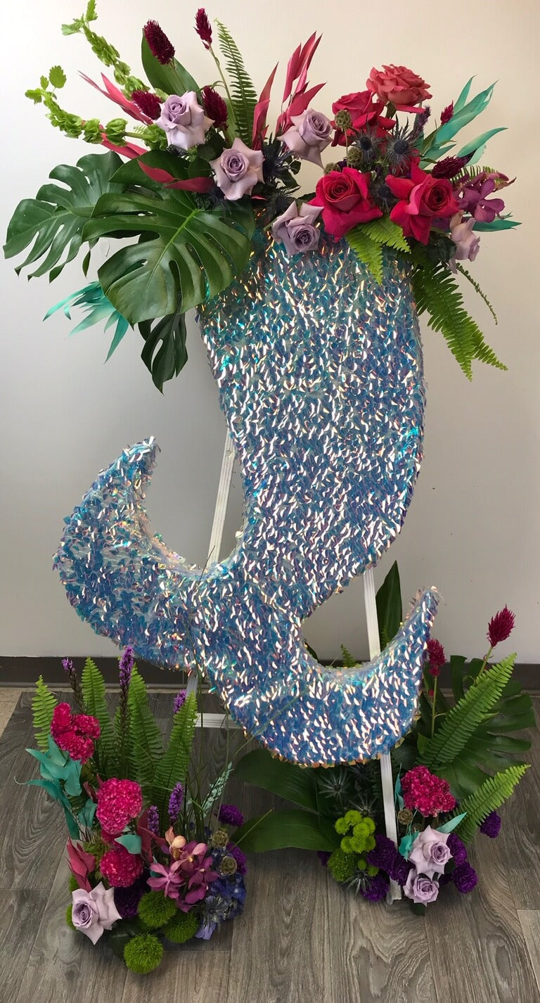 "Say goodbye to your loved ones with our Magical Mermaid Standing Spray Easel. Our top florists in Dallas, Texas have carefully crafted this elegant funeral flower arrangement for a beautiful farewell. With our reliable delivery, let us help you honor their memory."