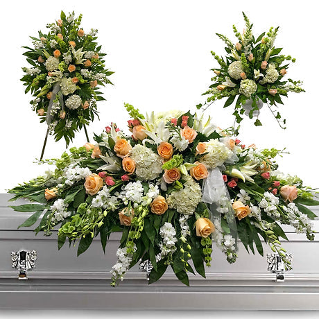 Easily send your condolences to loved ones with our Peach 3 piece set. Our dallas texas sympathy florist offers reliable funeral delivery for a convenient and comforting touch during difficult times. Show your support with this beautiful and thoughtful set.