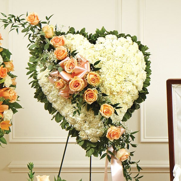 [ Height: 5' - 6' | Wide: 24'' ]This solid heart standing spray, accented with a slash of beautiful peach roses, is a timeless symbol of your love, sympathy and support. White carnations, peach roses, heather, and greenery. Solid heart with oasis in mache, tied to the wire easel with satin ribbon. Send sympathy and funeral flower arrangements and plants from Bloom Funeral Flowers.