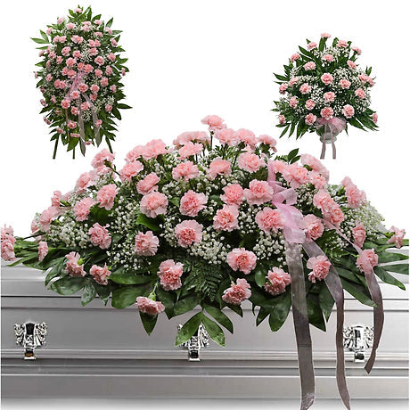 This 3 piece set features beautiful pink carnations, lovingly arranged by our Dallas, Texas florists, for a touching funeral delivery that expresses heartfelt sympathy. Let us help you convey your sincerest condolences with this special tribute.