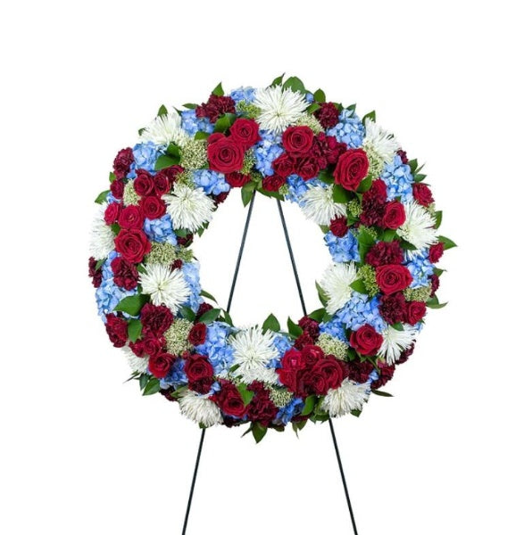 Red, Blue & True Wreath Standing Easel Spray