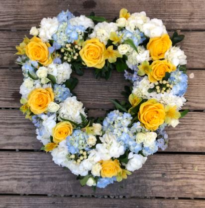 Beautiful heart shaped wreath designed, adorned with lush yellow flowers and pastel hues. Made to stand on easel.